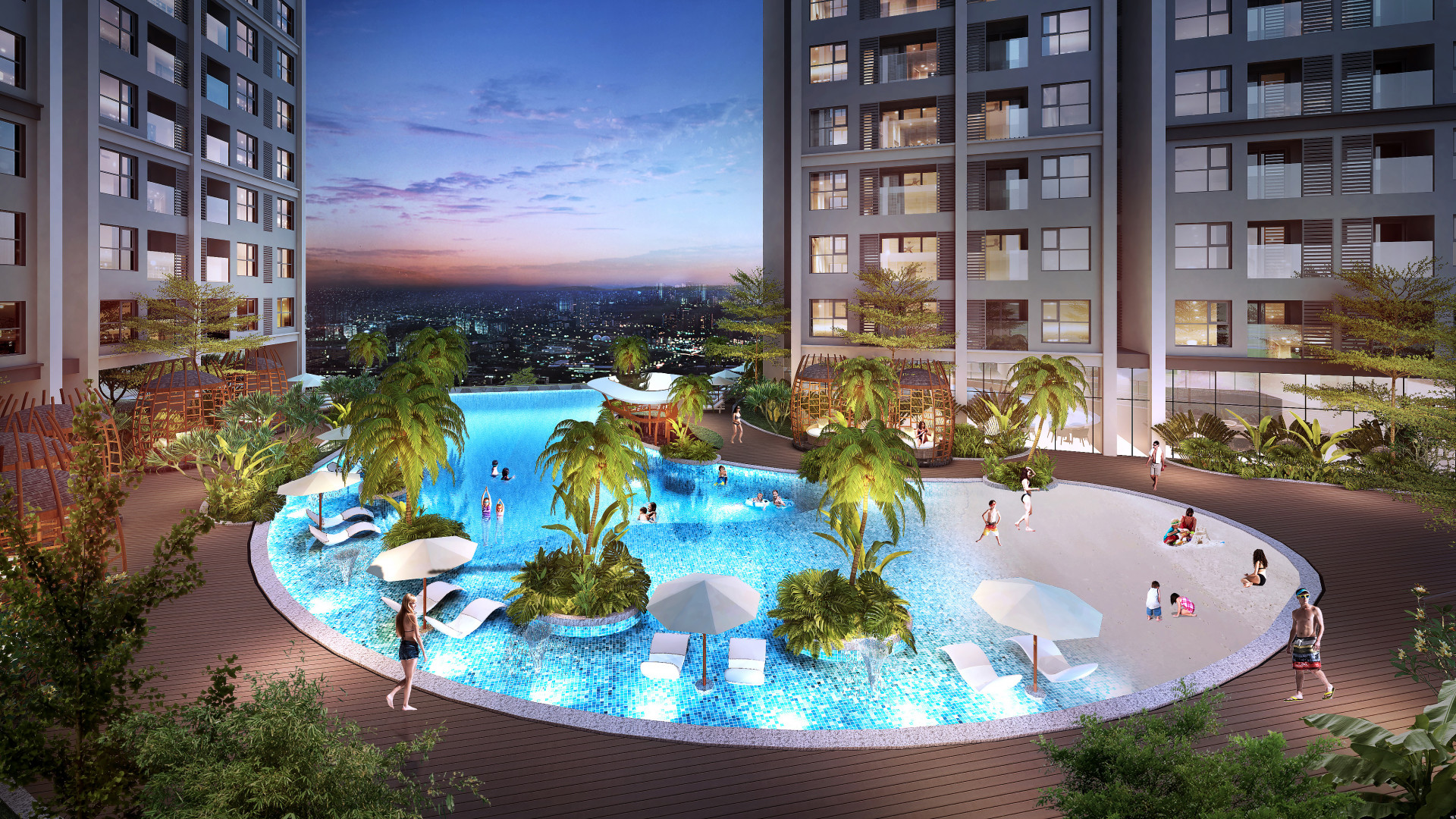 The project includes 2 HH1 areas with 3 apartment towers with 36 floors, and HH2 area with 2 towers of 36 floors. The towers are arranged and rotated to ensure the distance between the towers, optimize the beautiful views, and maximize the construction density on the expensive land. The highlight of the project is the elegant and unique cube-shaped towers designed in the shape of stars. The landscape over the podium is designed in tropical resort style with exclusive amenities like infinity pool , artificial beach, pool bar, kid zone, indoor pool,…
