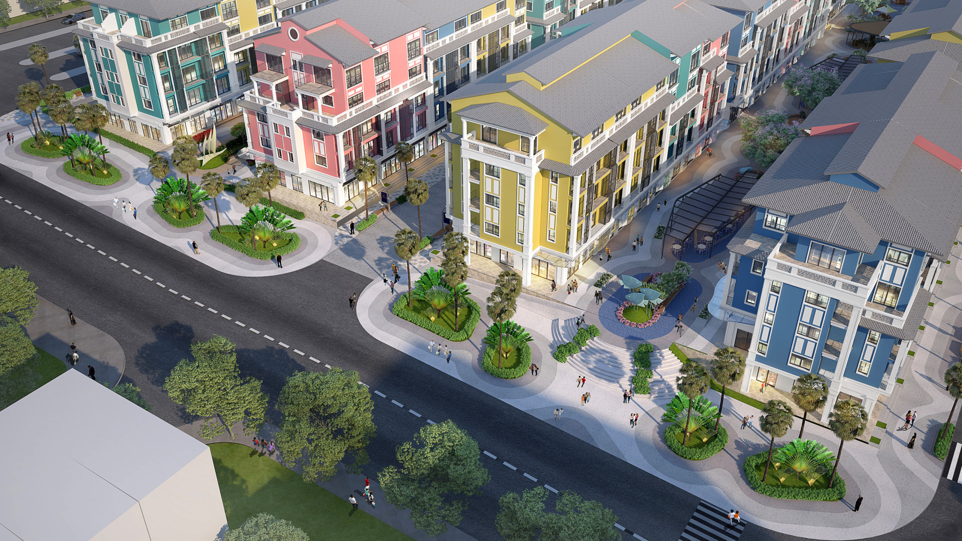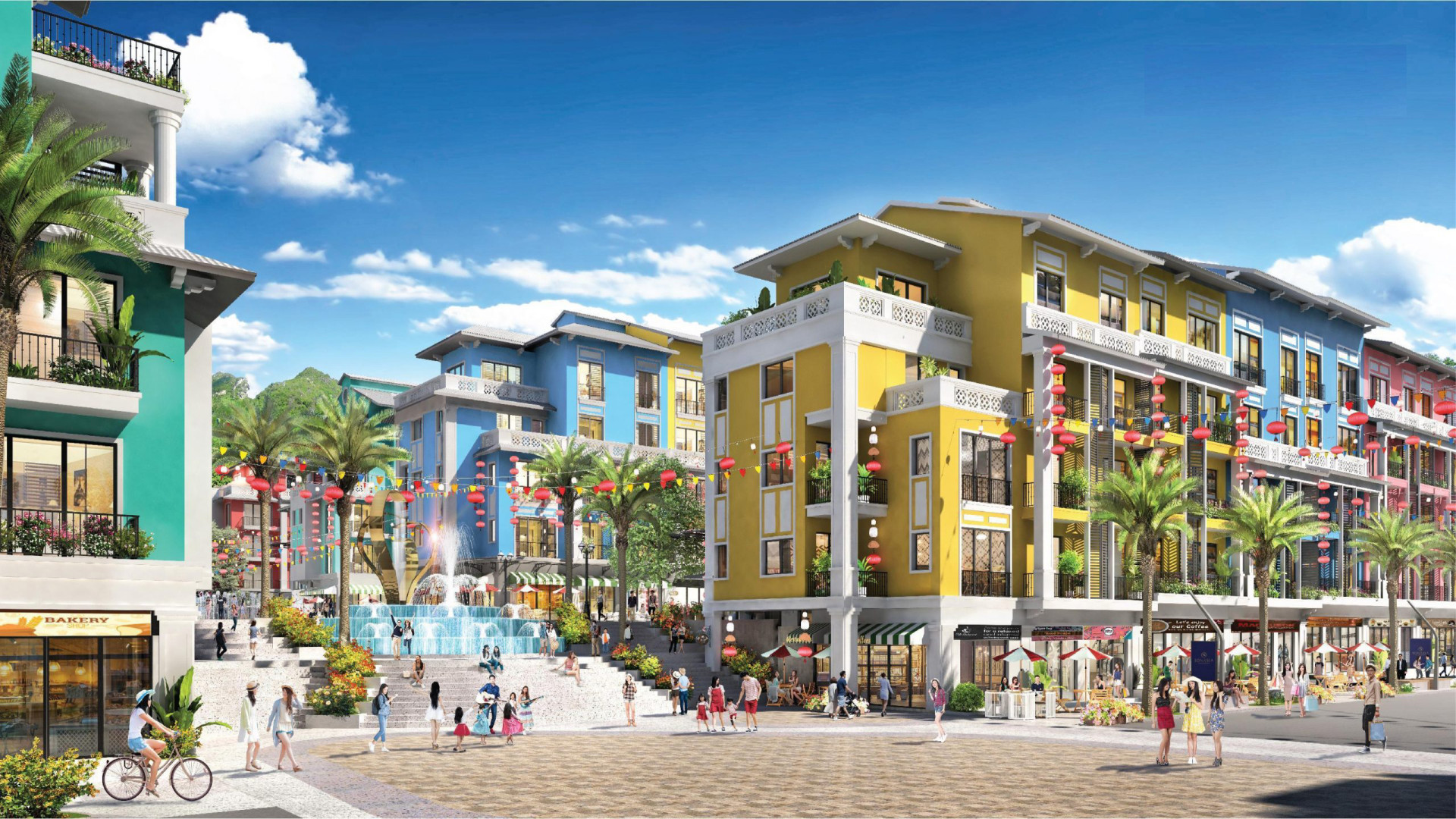 The shophouse cluster is in the phase 1 and in the strategic location of the entire Sonasea Masterplan, opposite to Sonasea Complex and Resort which is slated to be one of the largest resort in Van Dong SEZ (special economic zone). We aim to embed natural, cultural and local lifestyle value into the desing, to propose a outstanding design that reflect the booming development of region, while amplifying an unique, luxury and dynamic semi-outdoor shopping experience design. The architecture is an contemporary version of Singapore shophouse, an exemplary case of colourful bustling harbor city. The landscape design is inspired by the mini-islands in the bay, the ripple and flowing effect of wave, and is divided into several zones with distinct functions and activities, marked by corresponding signature elements.