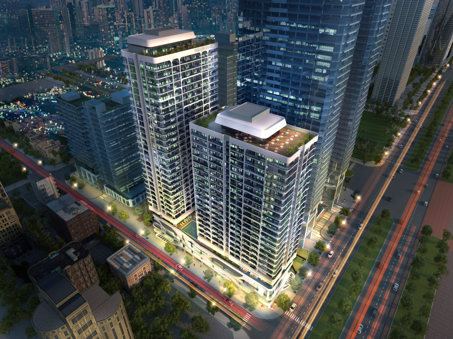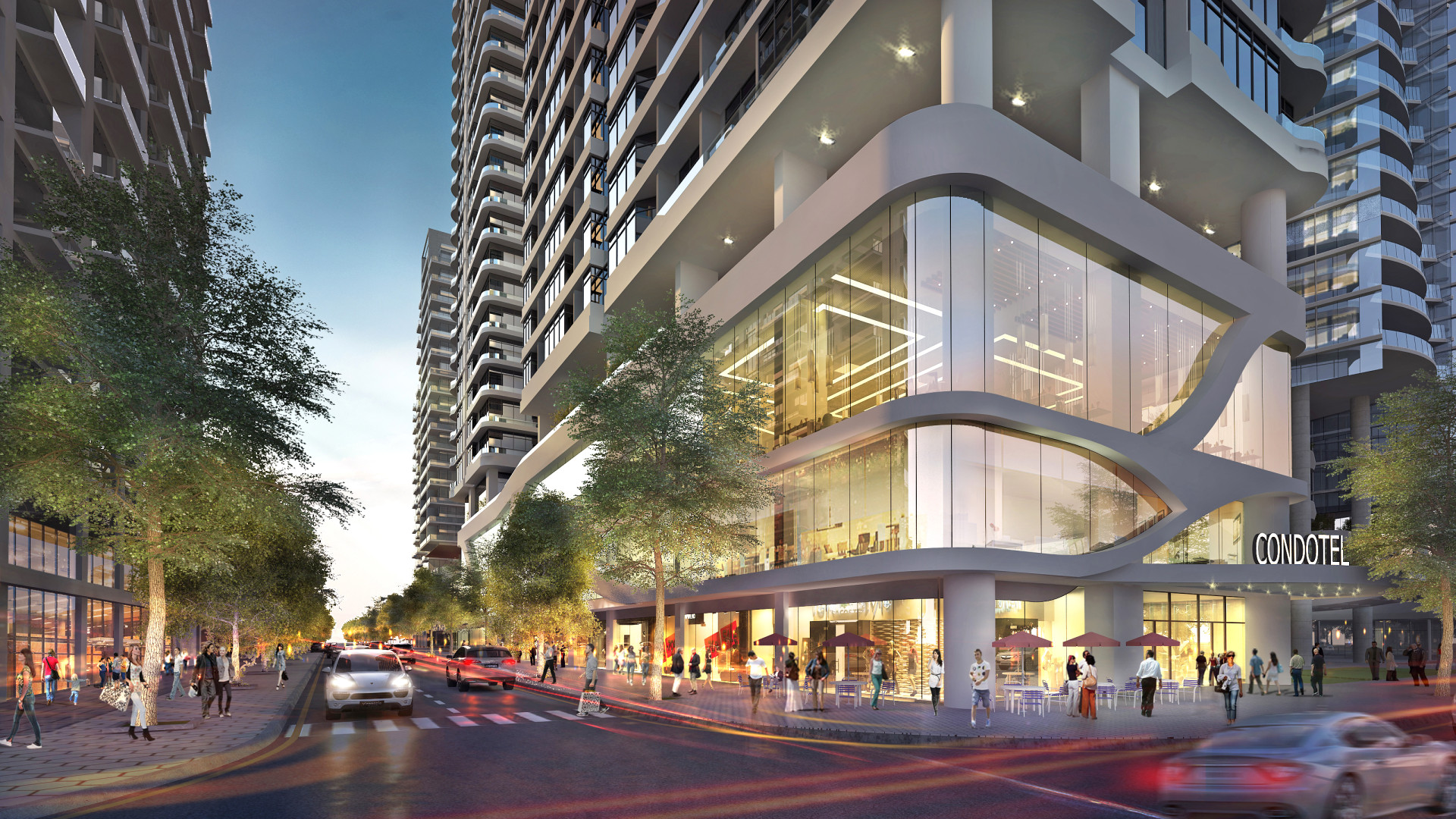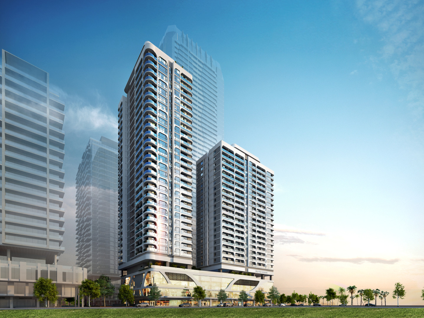 The complex consists of 2 condo-hotel towers with 591 apartments, sky bar, rooftop swimming pool, high-class restaurants, convention hall, gym & spa. The shophouses are located on 1st and 2nd floors of the building podium. The design of the building is inspired by the sea, which originates from the colors, lines of waves and sea plants, with the desire to bring a living space filled with air as well as the taste of the sea to residents and guests staying.