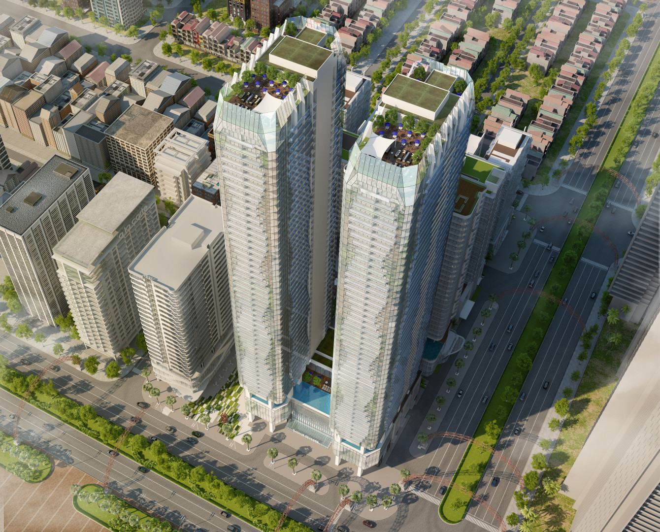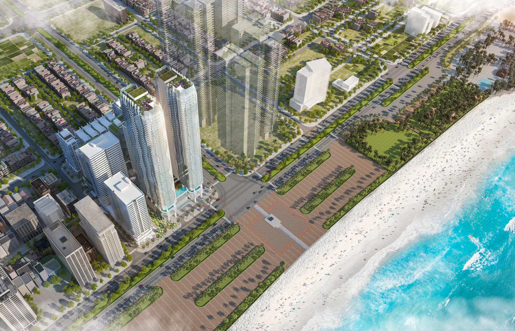 The land has the most beautiful location of the Danang Times Square project with a total area of 5,192m2 with 2 sides facing Pham Van Dong street and Vo Nguyen Giap street, directly accesses to the beach and East Sea park square. Thus, this land lot is preferred to build a complex project on with two towers of 50-storeycondo-hotel with the desire to to bring a landmark for the area and the city. The complex consists of 2 condo-hotel towers with 1,472 apartments, Sky bar, infinity pool overlooking the sea, high-class restaurants, large convention hall, gym & spa. The shophouses are located on 1st and 2nd floors of the building podium. The design of the building is inspired by the sea, which originates from the colors, lines of waves and sea plants, with the desire to bring a living space filled with air as well as the taste of the sea to residents and guests staying.