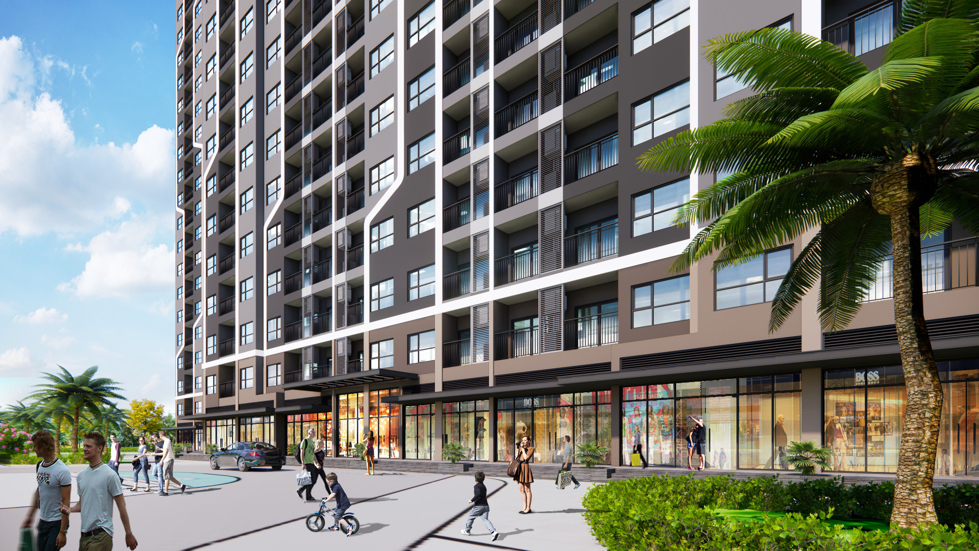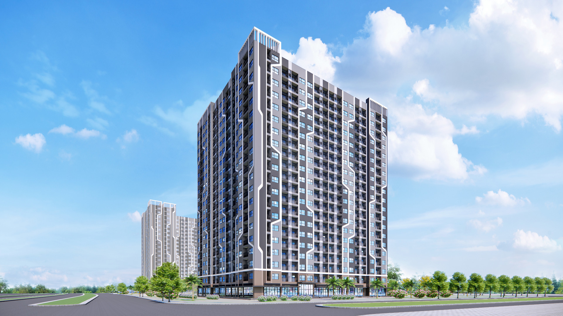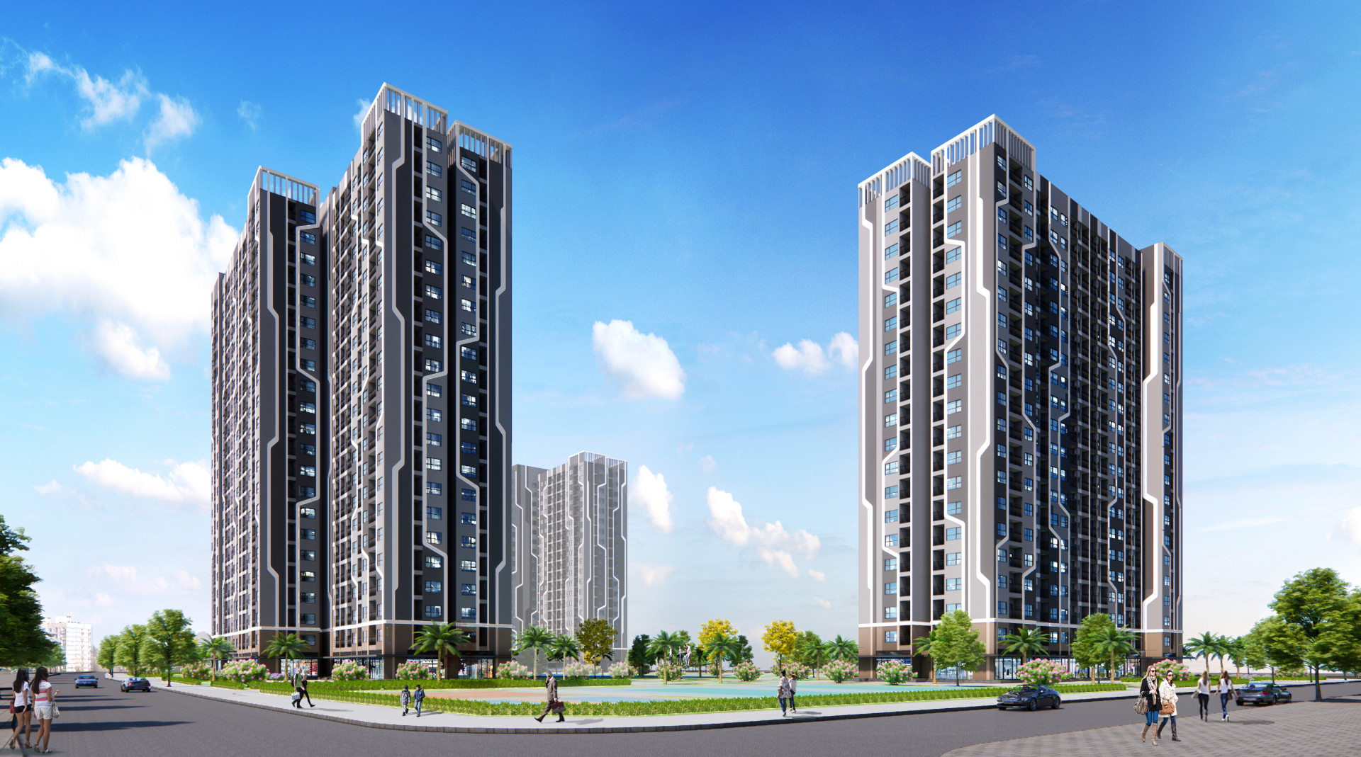 There are 3 20-story towers looking onto the the shared landscape in the center and share the same basement. The exterior is abstracted from the electrical mainboard which communicate the the dynamism and youthfull growth of the largest development in Thanh Hoa up to date.