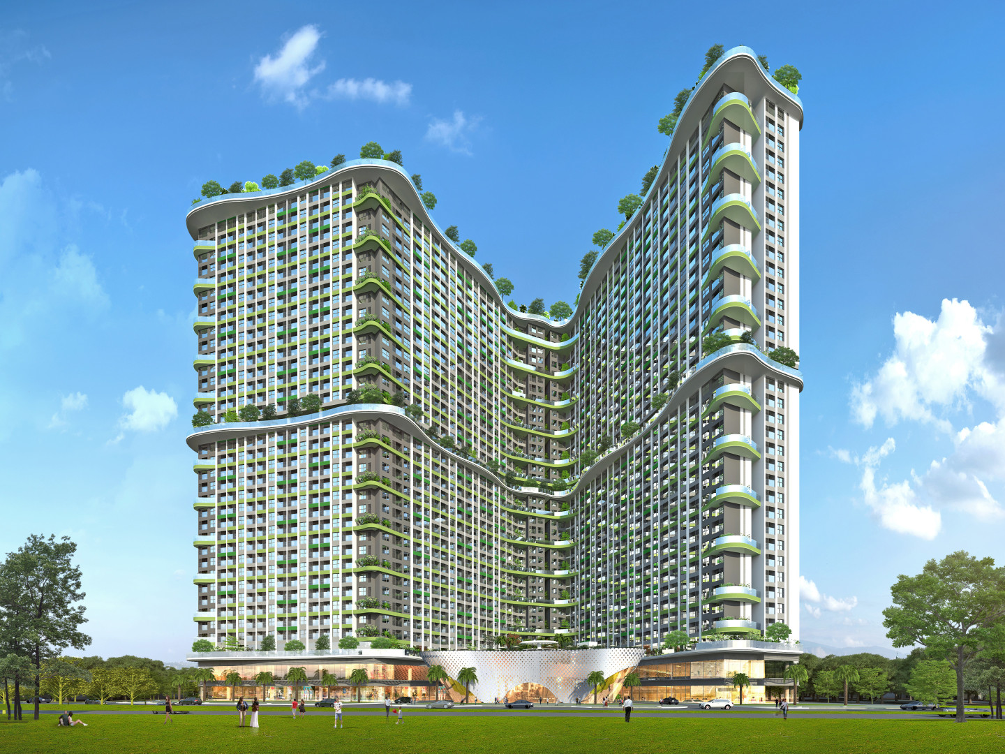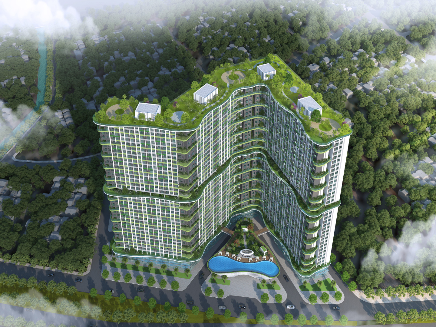 Với hạn chế của một khu đất có đường bao phức tạp, thiết kế từ bỏ cách tư duy thông thường về việc bố trí các tháp hình kỷ hà, thay vào đưa ra giải pháp tháp hợp khối uốn lượn và bám theo đường bao khu đất, vừa tối ưu về căn hộ, vừa tạo nên hình ảnh đặc sắc, mềm mại và khác biệt