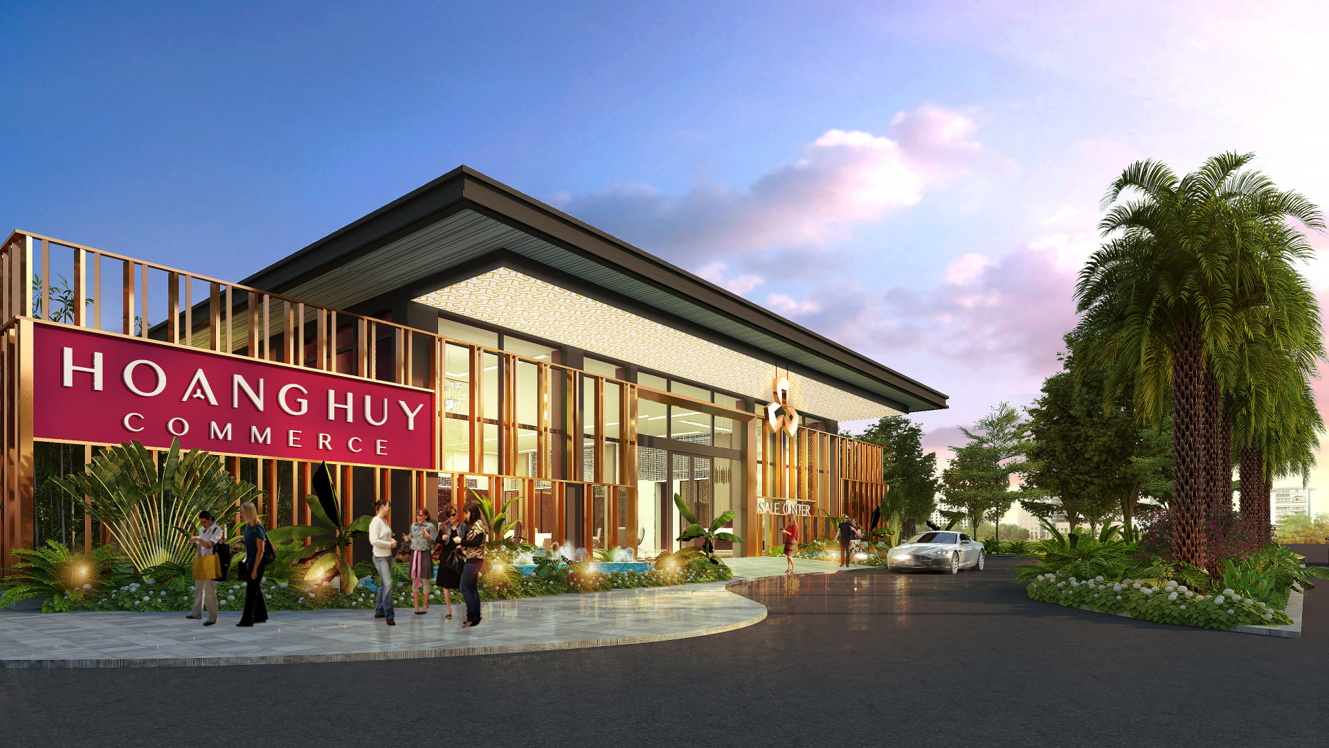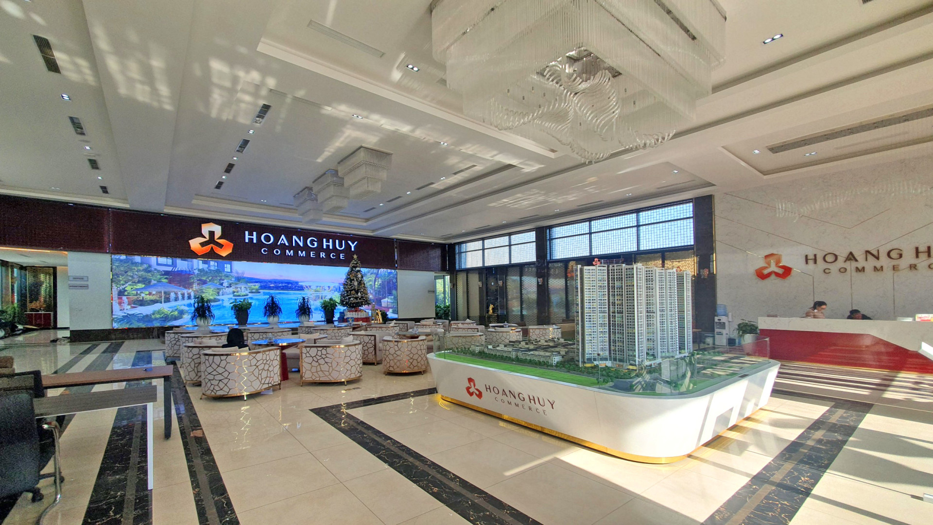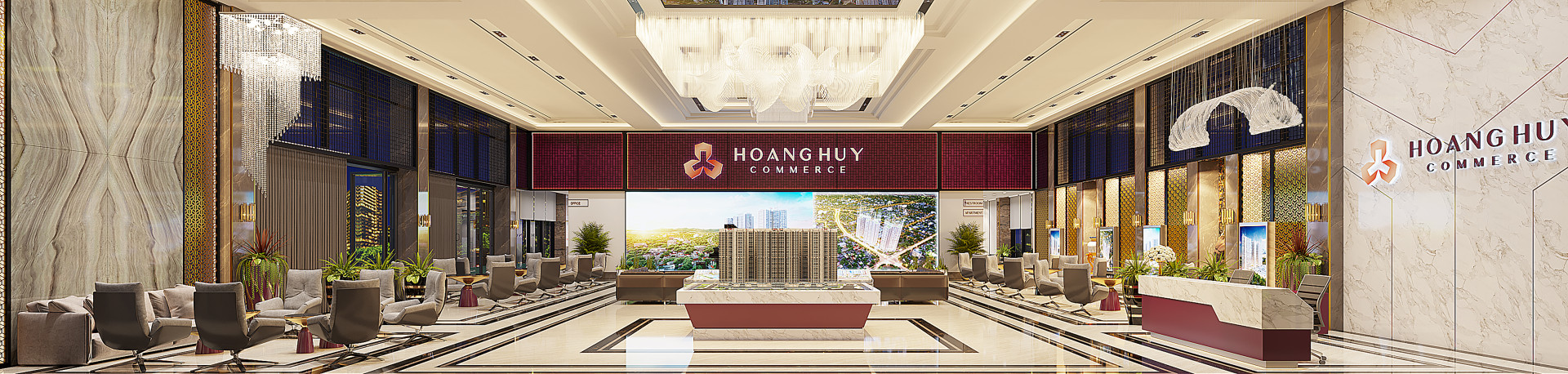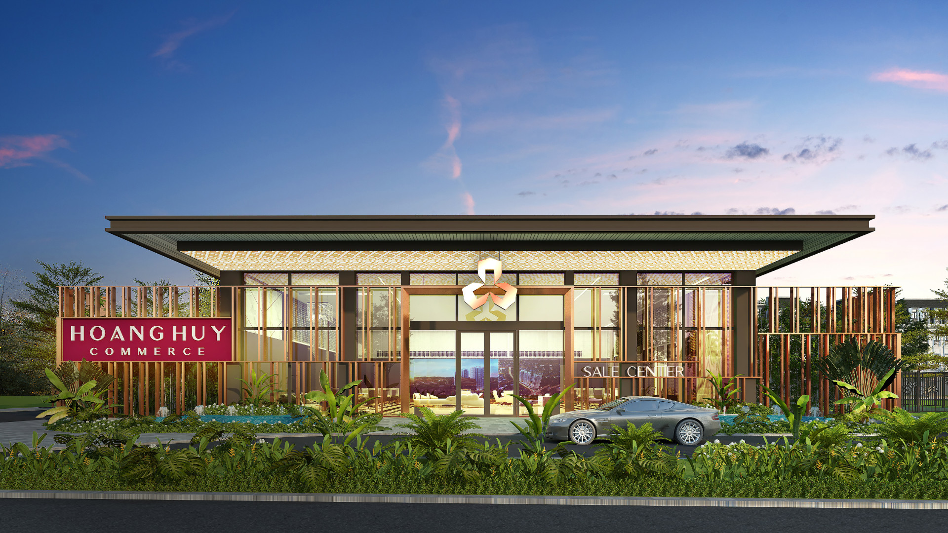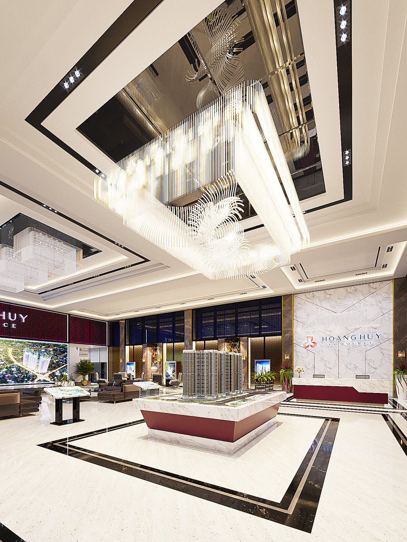 Nhà showroom được thi công tạm thời giữa 2 lô đất H1 và H2, với kết cấu khung thép để linh hoạt cho việc giải phóng. Thiết kế vỏ ngoài và cảnh quan gợi nhắc đến không khí nhiệt đới, và sử dụng màu sắc vật liệu đồng nhất với nhận diện thương hiệu chung của dự án. Thuận lợi, hoàn hảo cho những khách hàng có nhu cầu đến thăm quan và mua bán căn hộ. Phong cách thiết kế sang trọng, tiện nghi với tone màu sáng vàng cùng những điểm nhấn Decor cao cấp kết hợp với điểm nhấn là ngôi sao 3 cánh và mầu sắc nhận diện của tổ hợp Hoàng Huy Commerce.