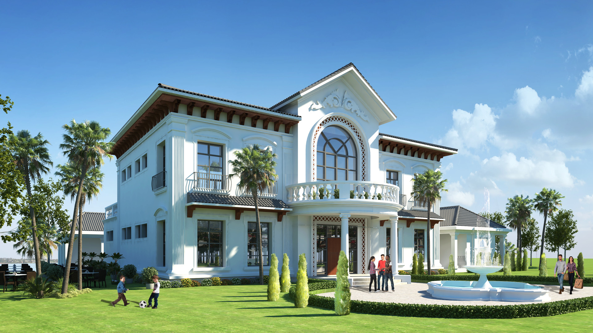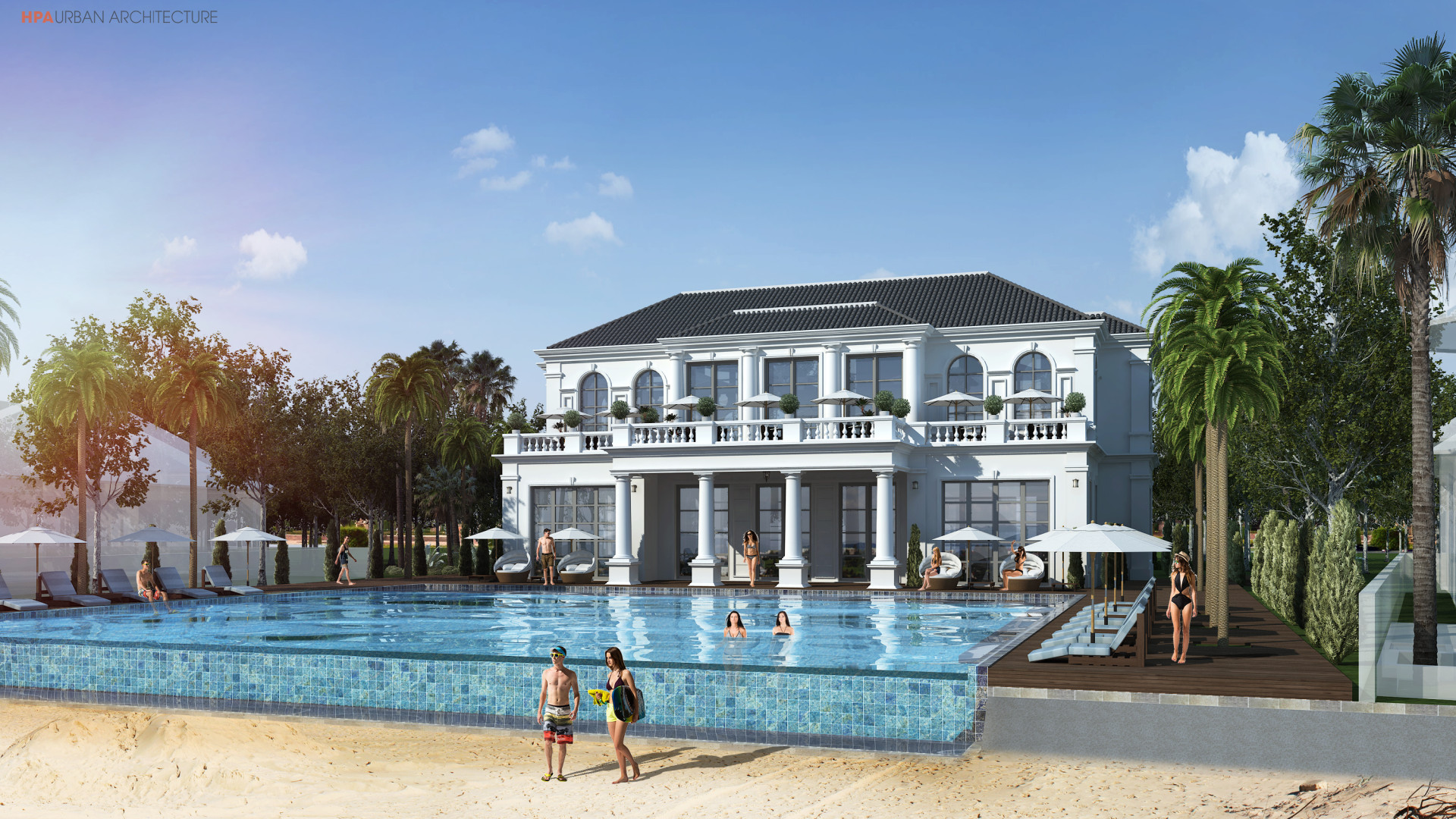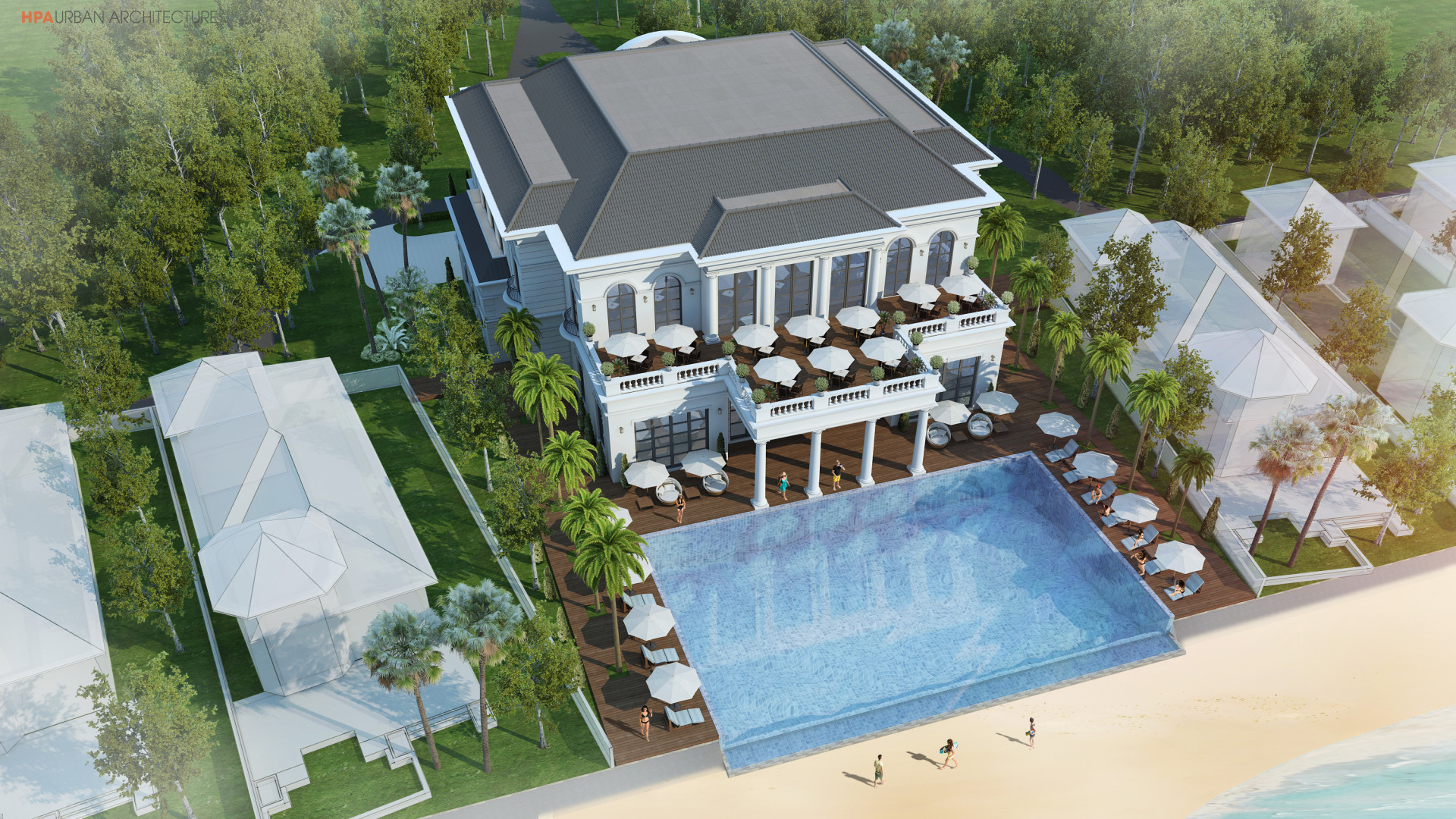 HPA thiết kế vỏ ngoài cho các nhà dịch vụ tiện ích của dự án biệt thự nghỉ dưỡng Vinpearl Đà Nẵng 2, bao gồm nhà chính, dịch vụ ven biển và nhà Gym-Spa cao từ 1-2 tầng. Thách thức là làm sao tạo nên kiến trúc đặc biệt làm các điểm nhấn cho quần thể biệt thự đồng thời vẫn hài hòa với kiến trúc biệt thự Pháp và cảnh quan xung quanh. Mỗi nhà dịch vụ được thiết kế nhất quán với phong cách bán cổ điển sang trọng và cân xứng, kiến trúc được nhiệt đới hóa như ban công và sân rộng hướng biển với mái ngói đua rộng. Tuy nhiên mỗi ngôi nhà đều mang những chi tiết phong phú riêng biệt dễ nhận diện.